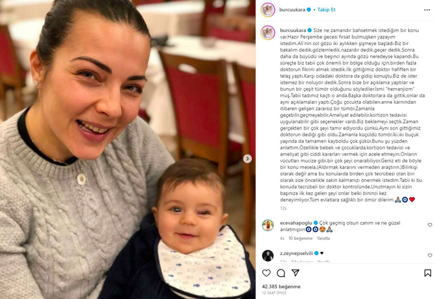Sosyal medya hesabından paylaşım yapan Burcu Kara, “Size ne zamandır bahsetmek istediğim bir konu var. Hazır perşembe gecesi fırsat bulmuşken yazayım istedim. Ali’nin sol gözü iki aylıkken şişmeye başladı. Biz ‘Bir bakalım’ dedik, gözlemledik, ‘Nazardır’ dedik, ‘Geçer’ dedik. Sonra daha da büyüdü ve beşinci ayında gözü neredeyse kapandı. Bu süreçte biz tabii çok önemli bir bölge olduğu için, birden fazla doktorun fikrini almak istedik. İlk gittiğimiz doktor hafiften bir telaş yaptı. Karşı odadaki doktora da gidip konuştu. Biz de ister istemez bir ‘Ne oluyor?’ dedik. Sonra bize bir açıklama yaptılar ve bunun bir çeşit tümör olduğunu söylediler. İsmi ‘Hemanjiom’ muş. Tabii tadımız kaçtı o anda. Başka doktorlara da gittik, onlar da aynı açıklamaları yaptı. Çoğu çocukta olabilen, anne karnından itibaren gelişen zararsız bir tümör… Zamanla geçebilir, geçmeyebilir, ameliyat edilebilir, kortizon tedavisi uygulanabilir gibi seçenekler vardı. Biz beklemeyi seçtik. Zaman gerçekten bir çok şeyi tamir ediyordu çünkü. Aynı son gittiğimiz doktorun dediği gibi oldu. Zamanla küçüldü tümör. İki, iki buçuk yaşında da tamamen kayboldu çok şükür” dedi.