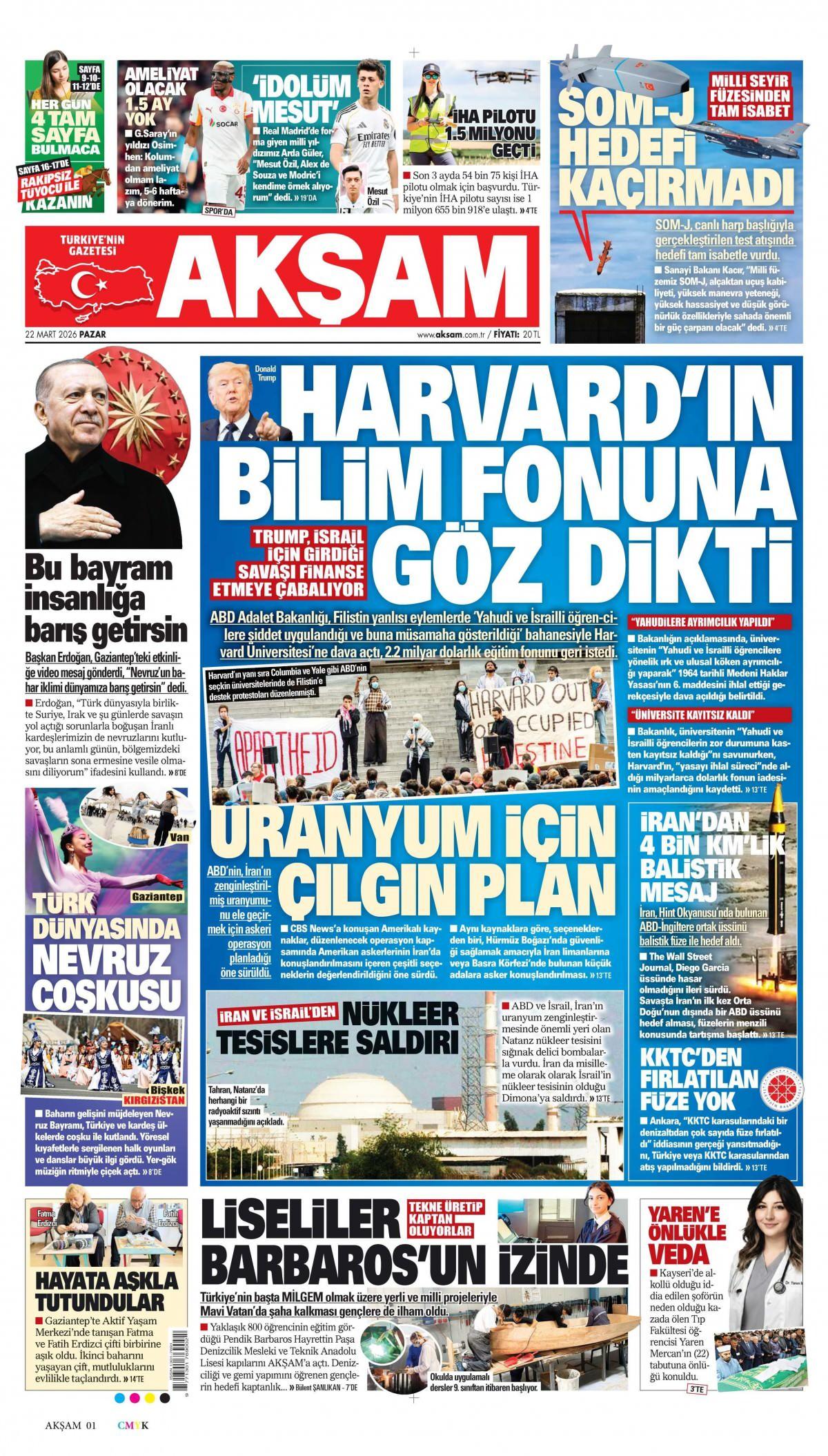 Akşam Gazetesi 23 Mart 2026 Günü Manşeti